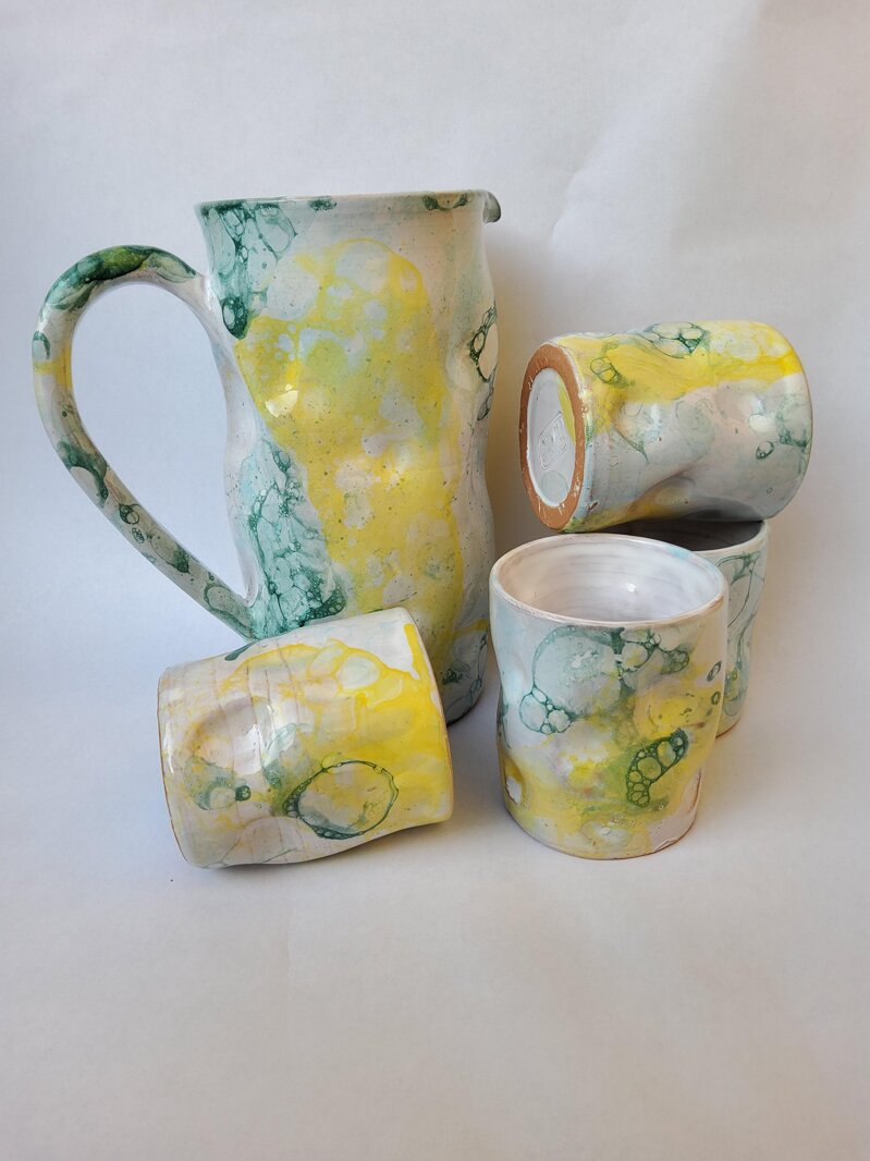 Set di brocca e bicchieri maiolica, decoro bolle verdi e gialle.